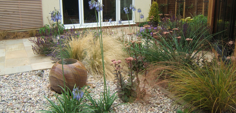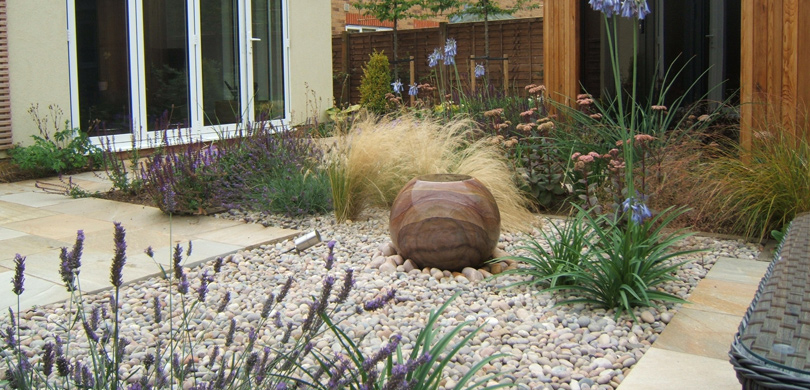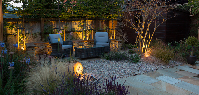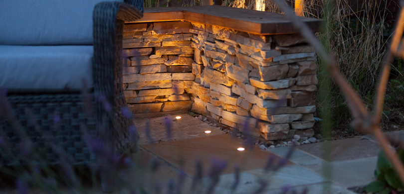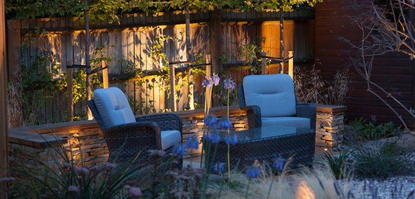 A main patio and smaller relaxed seating area are separated by a gravel garden with a small stone water feature. The smaller seating area is bounded on three sides by a dry stone wall highlighted with small, recessed lights after dark and topped with a teak capping so that it doubles as further seating.
