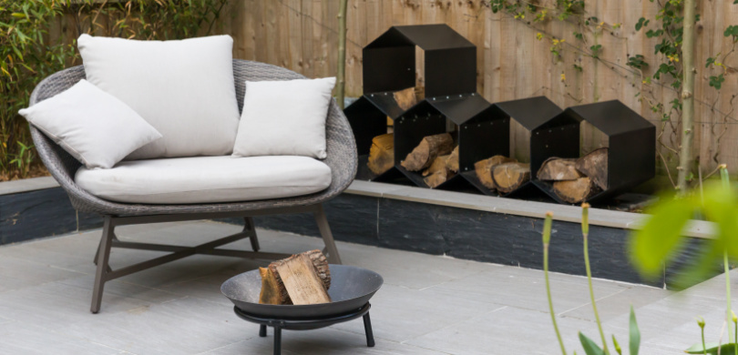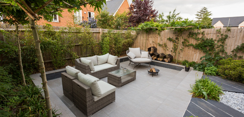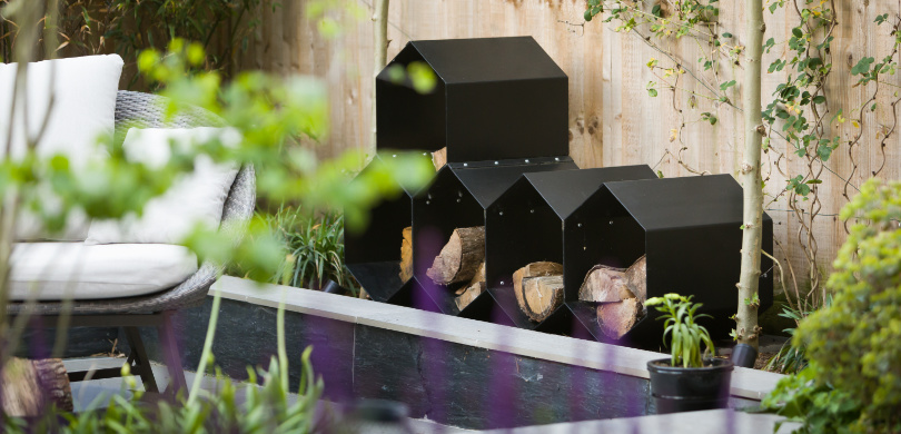 The innovative design was inspired by a hexagonal motif which was used both in the paving and a bespoke powder coated steel wood store. A sunken patio was created, paved in porcelain with roof trained trees planted either side and bamboo to the rear to create some privacy from neighbours. An unusual slate wood from CED Ltd was used for the hexagon centre section. The client wanted structural planting with some colour, and climbers will in time cover all the fencing creating a really green space. Subtle lighting completes the look.