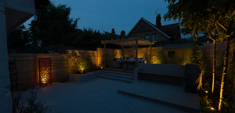 It made sense to use the level changes in the garden to create interest and also to avoid excessive earth removal (although quite a lot was still carted away!). The garden is divided into rooms with built in seating creating one area, a raised deck and pergola making a second area and the lower area making the largest space for the family to play in. A shed is tucked in the corner screened by bamboo and the whole look is finished with slatted western red cedar fencing. A feature laser cut screen and the brackets for the seat were powder coated the same colour to add a colour pop to the space. Finally, three mature parasol trees were planted to create privacy, giving height and green structure to the space.